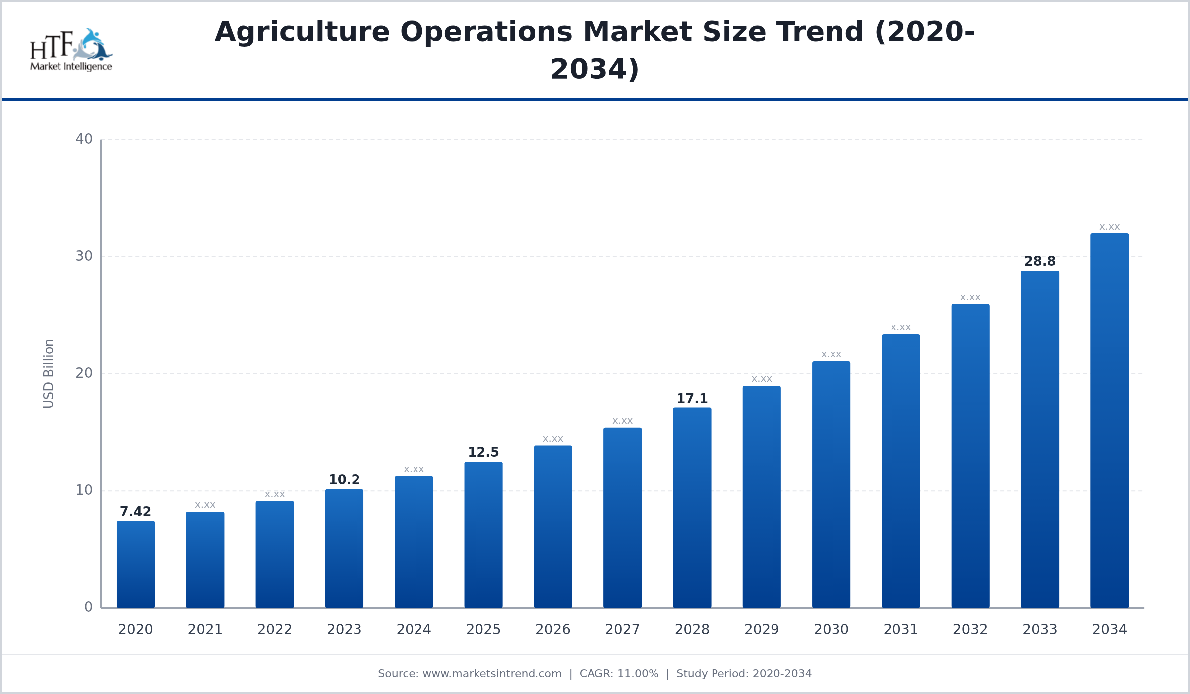 The global Agriculture Operations Market is projected to grow from USD 12.5 Billion in 2023 to USD 38.7 Billion by 2034, exhibiting a robust Compound Annual Growth Rate (CAGR) of 11.0%.